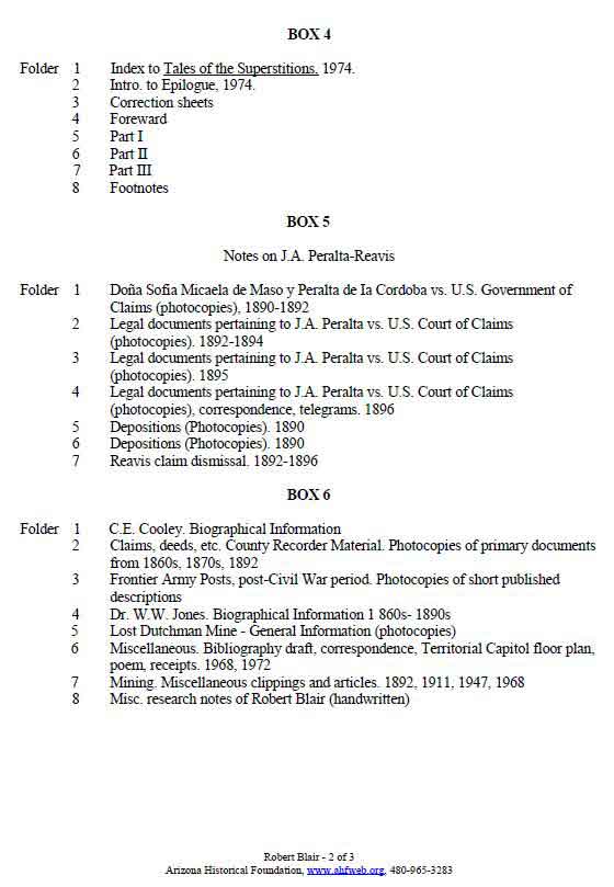 From our viewing fo the Blair Files, I thought there were 7 boxes? We spent a day there and It would take a much longer period to go through all of the information. I think we only worked with a couple of boxes. I would have to go back and look at the material we copied as I'm not sure now what we were looking for. I know we copied some Reavis (Peralta) information and I think a letter from Greg Davis's brother correcting what Blair had wrote as to the location of Waltz mining activities in California. I'm sure there were other things we copied.
