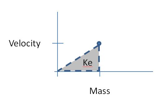 So I’m wondering if he did any actual scientific analysis. For example, bullet energy in foot-pounds can be calculated with: Ke = (.5)((Mass)(Velocity)^2). (If anyone’s wondering why the mass and velocity are first squared and then divided in half, look at the graph and it will make sense. The mass and velocity, when plotted, form a right triangle. All that stuff in the triangle is kinetic energy. The easiest way to integrate the area of a right triangle is to just make it a square, then divide it in two.) We also know that holes can be made in bone with bullets at such little velocity of 200 FPS, so somebody somewhere has done all the math regarding holes in skulls.