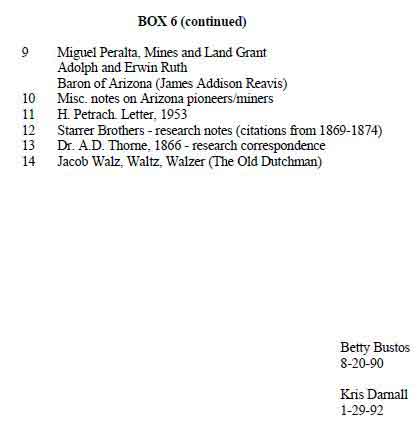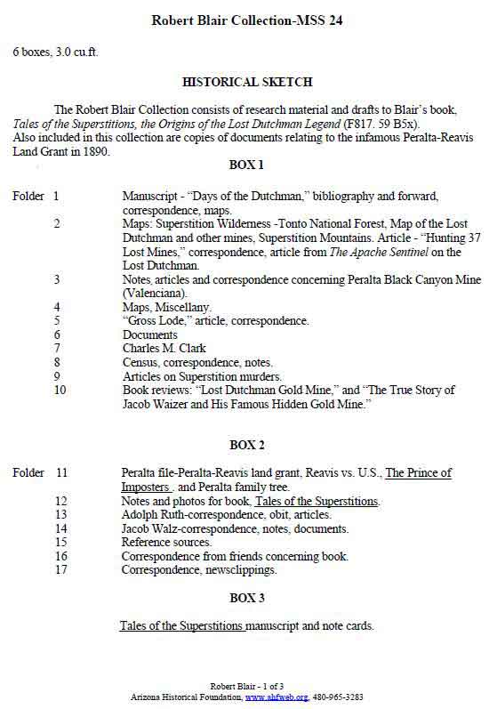 From our viewing fo the Blair Files, I thought there were 7 boxes? We spent a day there and It would take a much longer period to go through all of the information. I think we only worked with a couple of boxes. I would have to go back and look at the material we copied as I'm not sure now what we were looking for. I know we copied some Reavis (Peralta) information and I think a letter from Greg Davis's brother correcting what Blair had wrote as to the location of Waltz mining activities in California. I'm sure there were other things we copied.
