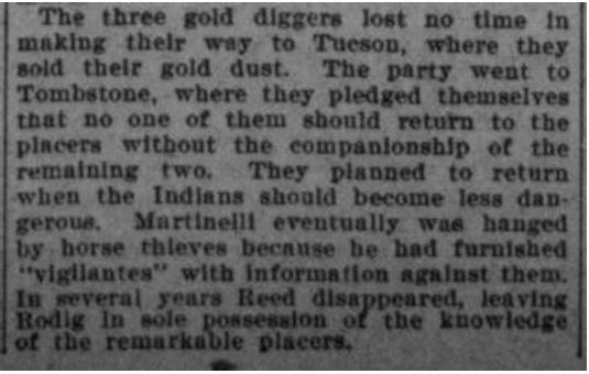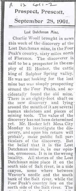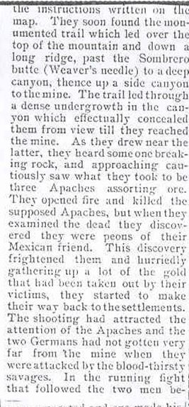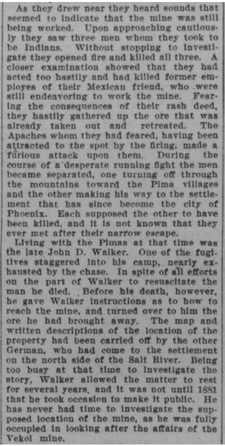 For example, in a reprinted article in the Phila. Times, 23 JAN 1902 (I have never found the source), there is a story of a Mexican from Sonora with a large party of “employees” getting attacked by Indians while mining south of the Salt near Weaver’s Needle, leaving the area due to those attacks, and subsequently telling a German about the mine. January 1902! Only 10 yrs and 3 months after Waltz’s death.