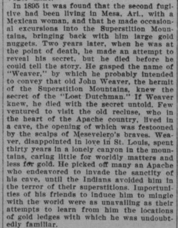 I doubt Weedin would add a "Weaver" to the LDM story either...I may be wrong, but I think the reference to an old hermit "John Weaver" is unlikely to have come from either Weedin or Bick. Both men would have known who Elisha Reavis and Pauline Weaver were. Thankfully, Weedin's article contains no such story.